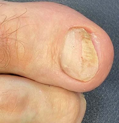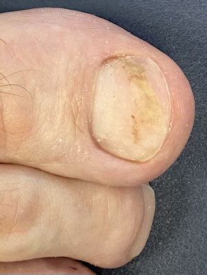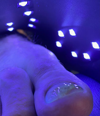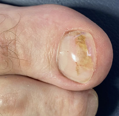 Auf den Bildern sehen Sie einen Traumanagel, entstanden nach einer langen Wanderung. Damit sich das Nagelbett nicht verkleinern kann, wurde bei diesem Patienten eine Prothese in der Breite des ursprünglichen Nagels aufgebaut. Unser lichthärtendes Nagel-Gel ist medizinisch geprüft, keim- und pilzhemmend und passt sich durch seine hohe Elastizität den natürlichen Abrollbewegungen an.